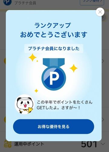 新年早々に楽天ポイントクラブのアプリでポップアップ通知が出ました。 「ランクアップおめでとうございます プラチナ会員になりました」と。 楽天市場は今まではずっとゴールドでしたが初めてプラチナになりました。すげぇ~。 でも具体的になんか特典あん…